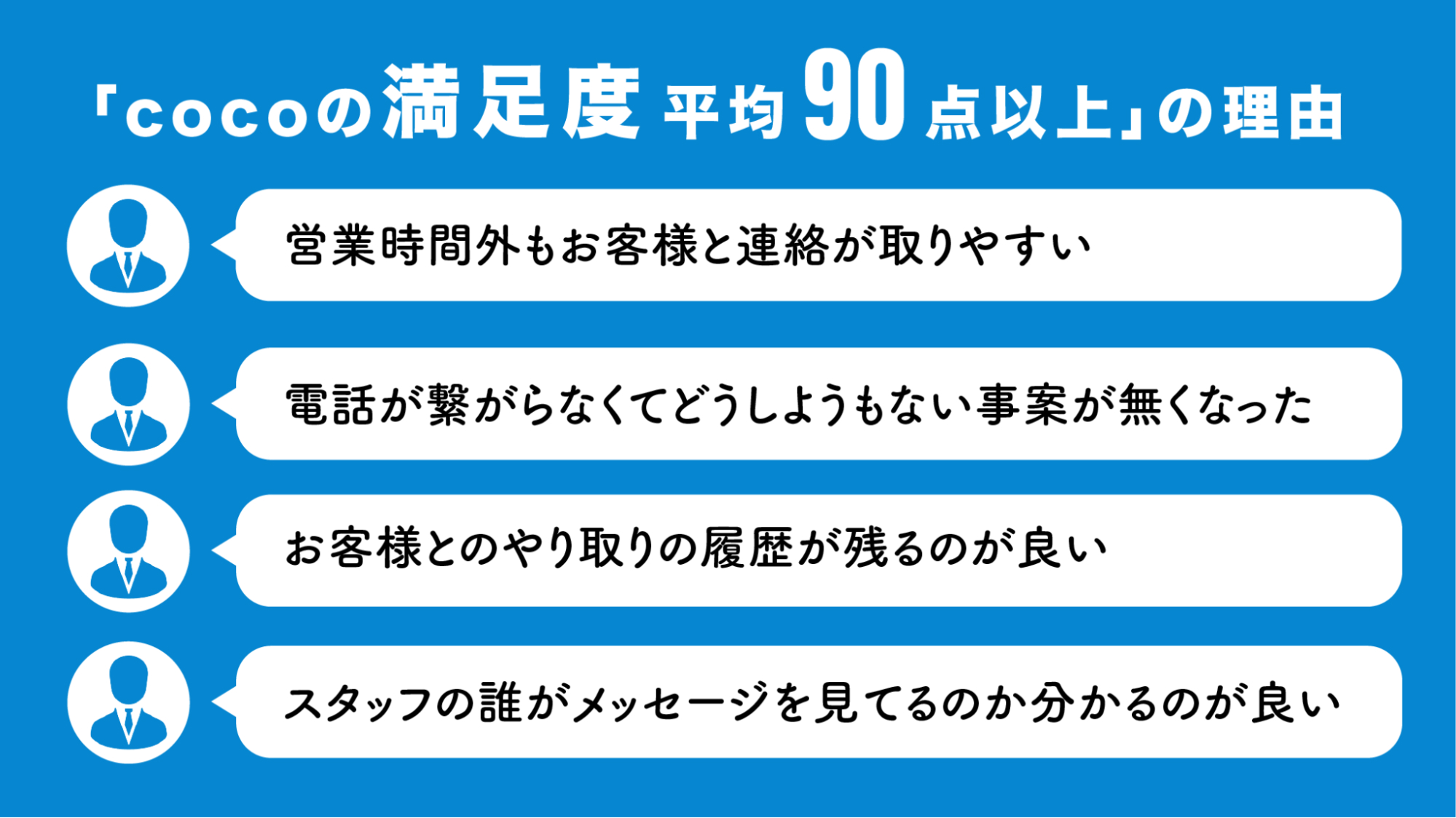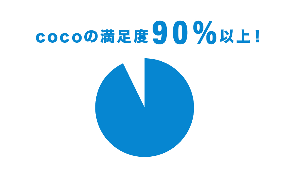 cocoの満足度を点数化していただいたところ、「cocoの満足度平均90点以上」と回答していただきました。