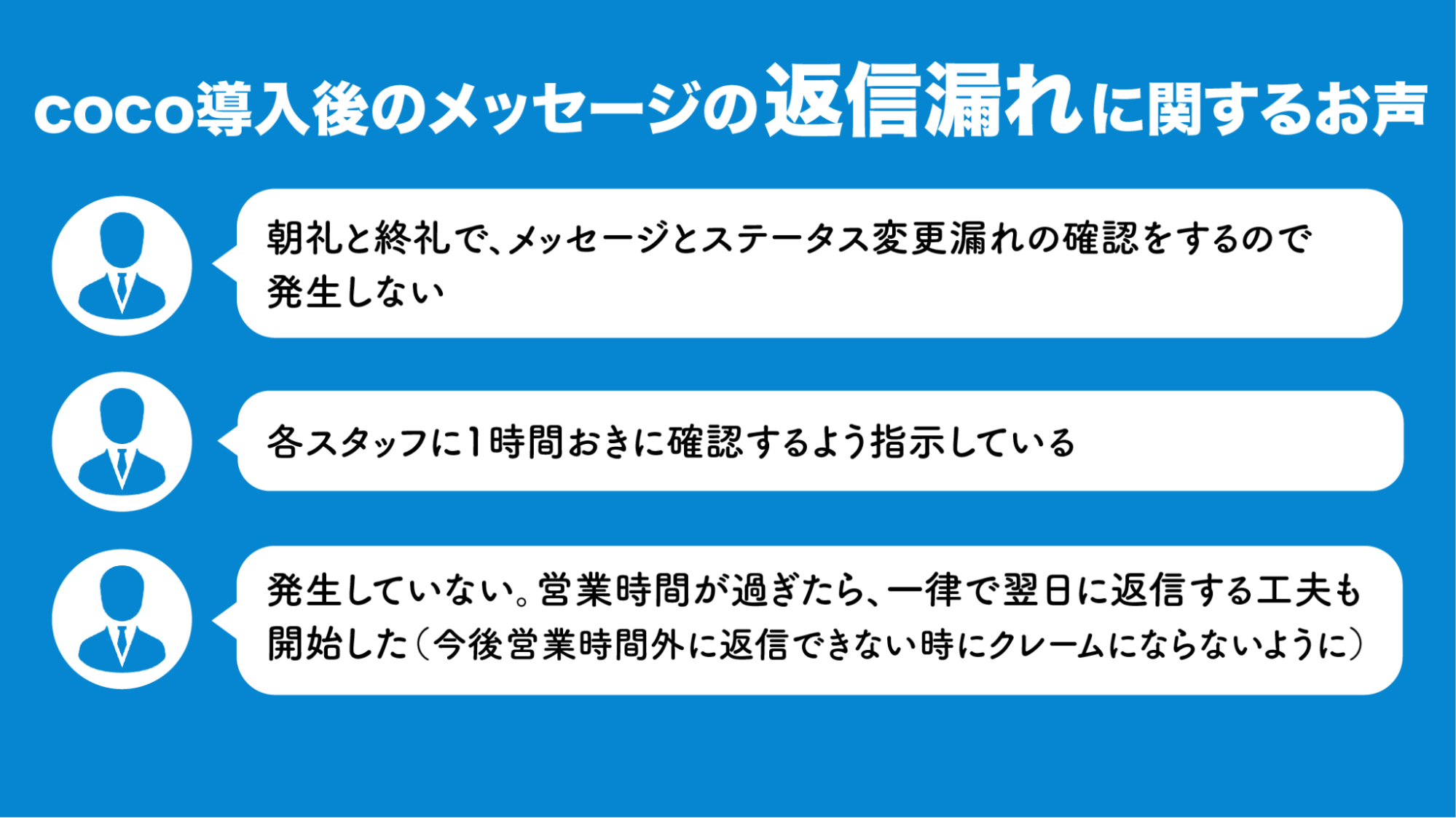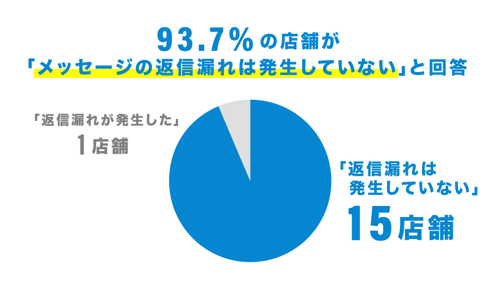 16店舗中15店舗が 「メッセージの返信漏れは発生していない」と回答いただきました。