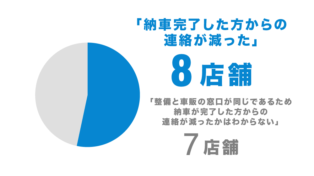 16店舗中8店舗に 「納車完了した方からの連絡が減った」と回答いただきました。また、「整備と車販の窓口が同じであるため、納車が完了した方からの連絡が減ったかはわからない」と7店舗が回答。