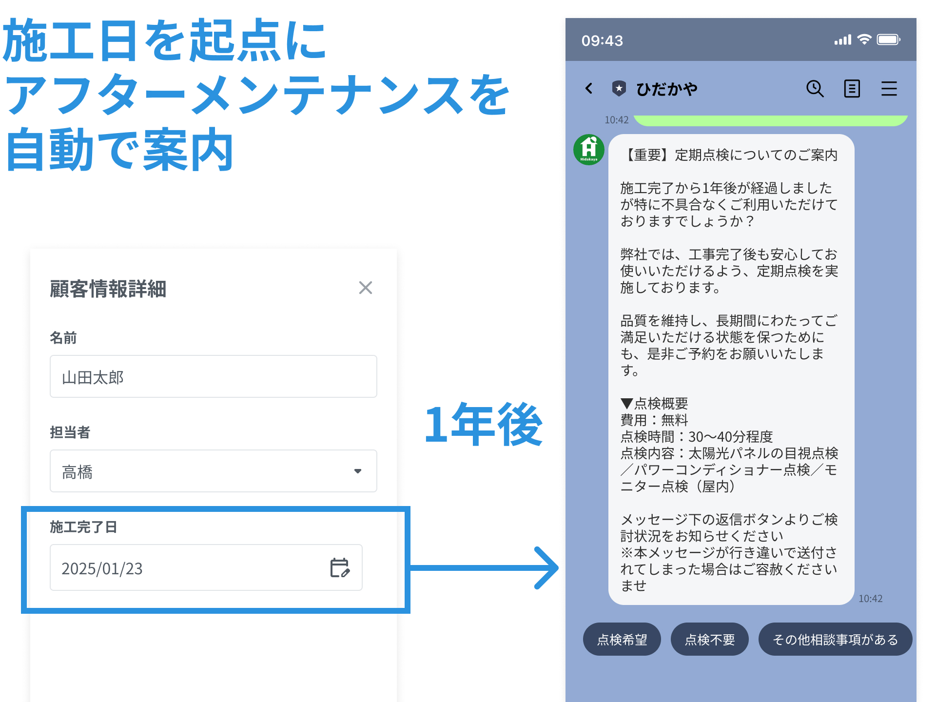 2つ目は、アフターメンテナンス案内の効率化です。累計2,000〜3,000件の既存顧客に対してメンテナンスを案内すると、丸2日ほど掛かってしまいます。この状況を改善したいと考えていました。